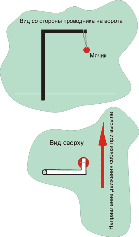 В зависимости от промотивированности собаки и ее прошлого опыта мы определяем расстояние, на котором устанавливаем некую конструкцию. Она делается из стальной проволоки диаметром 4-5мм и напоминает букву "Г". На конце перекладины мы загибаем нашу проволоку еще раз по направлению движения собаки сантиметров на 7-10. Именно на эту загогулину вешается (а не кладется на землю) мячик. Высота подвеса такая, чтобы собака могла снять его не замедляя хода. Смысл этого в том, что собака посланная на эту конструкцию: